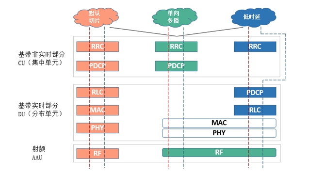 (1)协议栈功能模块化分离 根据业务需求的不同,可以灵活地对无线网侧协议栈功能进行定制切分。无线侧基站分为CU(集中单元)和DU(分布单元)两个单元,这两个单元是BBU拆分来的。解耦后的CU用于集中承载非实时业务,DU则主要负责对实时业务的处理,因此可以把跟时延相关性不大的功能上移到CU,跟时延强相关的下放到DU。像单向多播类业务就可以让这个切片功能最简化,而低时延类业务可以把CU里的一些功能下沉到DU。