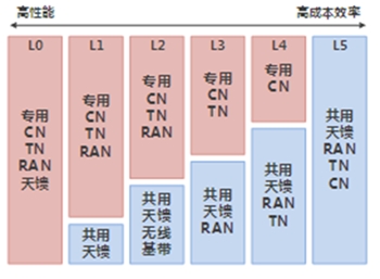 目前网络切片粒度按网络的隔离程度分为L0 - L5一共六级,在业务对网络QoS(服务质量)要求相对不高时,共用网络资源(L5粒度)会为运营商带来更高的成本效益。当需要高QoS业务保障需求后,需要逐步向L0粒度的切片策略演进,以获得更高的性能保障。